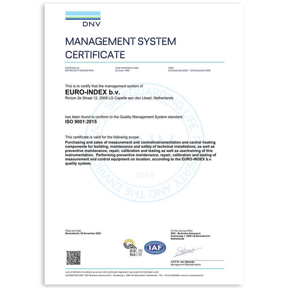 On June 22, 1999 EURO-INDEX b.v. has received the ISO 9001:2015 certificate from DNV.GL. EURO-INDEX is certified for purchasing, sales and rental of measurement and control instrumentation and central heating components for building, maintenance and safety of technical installations, as well as preventive maintenance, repair, calibration and testing of this instrumentation. Performing preventive maintenance, repair, calibration and testing of measurement and control equipment on location, according to the EURO-INDEX b.v. quality system.