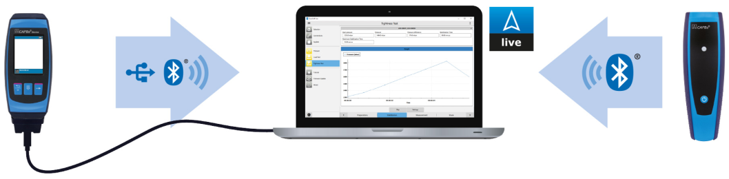 Als u met EuroSoft live software via Bluetooth® contact maakt met een CAPBs® module handgreep of CAPBs® device handgreep worden de meetwaarden en menu’s weergegeven zoals op een BLAUWE LIJN® meetinstrument, inclusief de bediening. U kunt de actuele meetwaarde(n) uitlezen, evenals de maximaal en minimaal gemeten waarde en deze presenteren in een meetrapport. Het is ook mogelijk om meetwaarden gedurende een periode te loggen met een instelbaar interval. Deze meetwaarden kan u zowel numeriek als grafisch weergeven. Bepaalde sens meetmodules bieden aanvullende applets, zoals een lekhoeveelheidsmeting (druk) of een meetfunctie voor legionellapreventie (temperatuur).