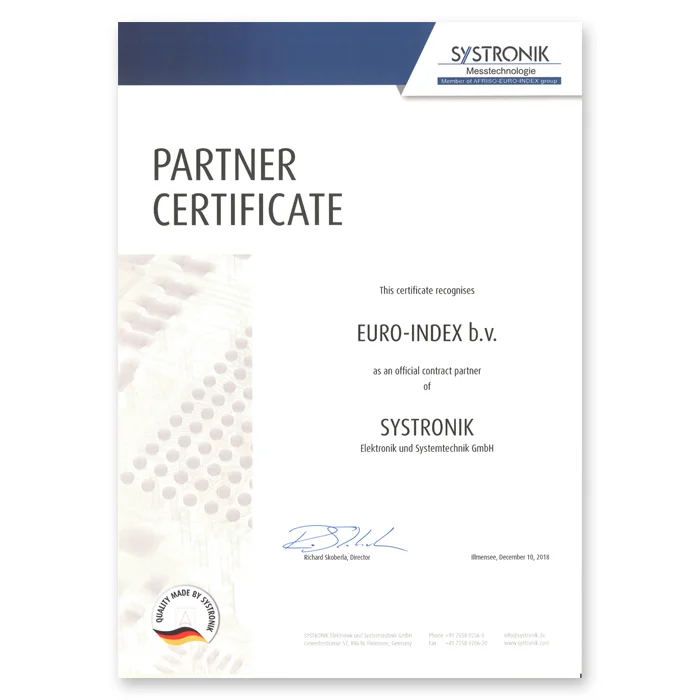 EURO-INDEX heeft diverse vestigingen in landen door heel Europa. Bij Systronik in Illmensee (Duitsland) worden BLAUWE LIJN® meetinstrumenten ontwikkeld en geproduceerd door hooggekwalificeerd personeel met toepassing van de modernste technologieën. Systronik maakt deel uit van de EURO-INDEX groep.