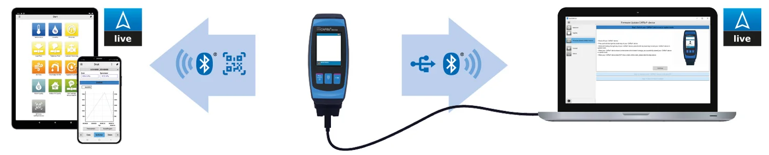 Bluetooth® communicatie maakt het mogelijk om de meetwaarden draadloos naar een PC of laptop met Eurosoft live software te sturen en digitale meetrapportage te maken. U kan tevens gebruik maken van de gratis EuroSoft live app (Android en iOS) om met de CAPBs® device te communiceren.