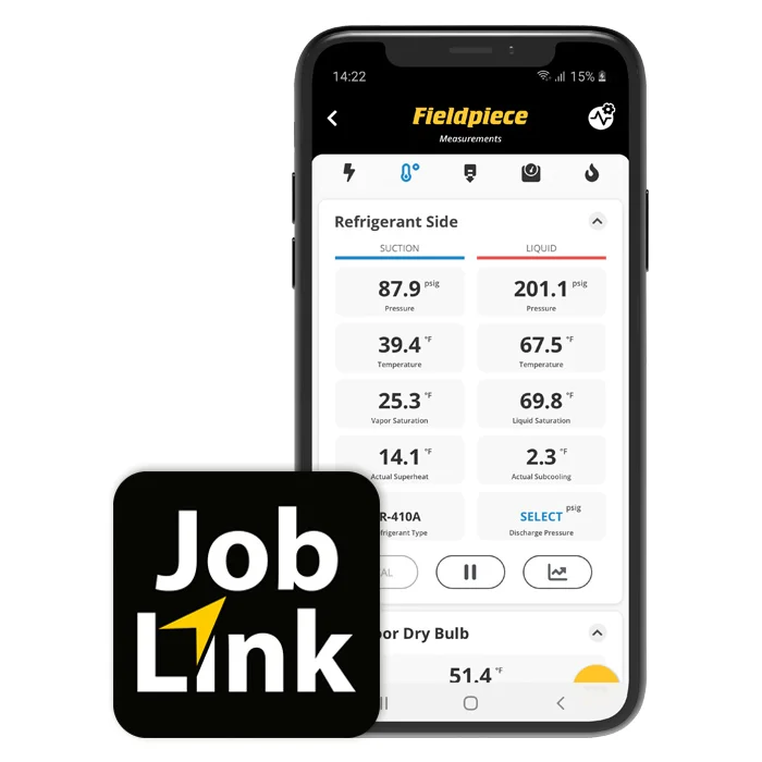 Door een Job Link® verbinding van een instrument naar een manifold te maken worden de meetresultaten van het instrument toegevoegd aan die van de manifold en gelijktijdig weergegeven. Door een Fieldpiece instrument via Job Link® te verbinden met een smartphone of tablet met de Job Link® app kunnen meetresultaten in realtime worden uitgelezen, geanalyseerd en als meetrapportage worden gedeeld.